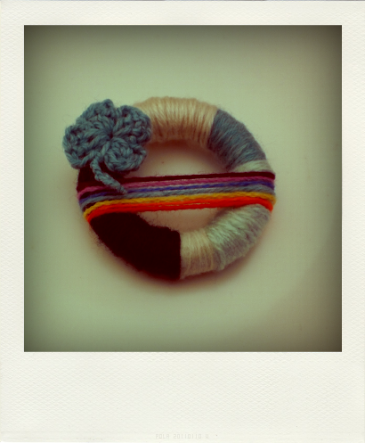 Step 4: Wrap your yarn around the ring. When you want to change colours, use a bit of hot glue to stick down the end of your current colour and then repeat Step 3 to start the new colour. Wrap until the entire ring is covered in yarn.