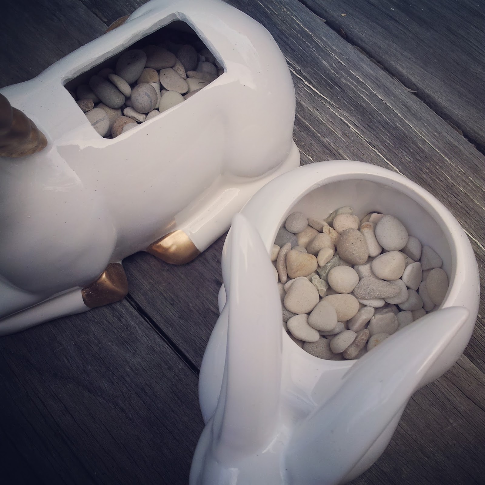Hello! My experiments in growing succulents from cuttings and leaves have reached the stage where I have a *lot* of new plants, and no where near enough pots. To remedy this, I headed off to the discount store (because I am nothing if not cheap) but they only had plain plastic pots in their gardening section, which didn't rouse much excitement. However, as I was heading back out via the homewares section, I spotted an amazing unicorn money box and a really sweet little bunny dish. You know what they say, "when life gives you moneyboxes, make planters!" ~___^
